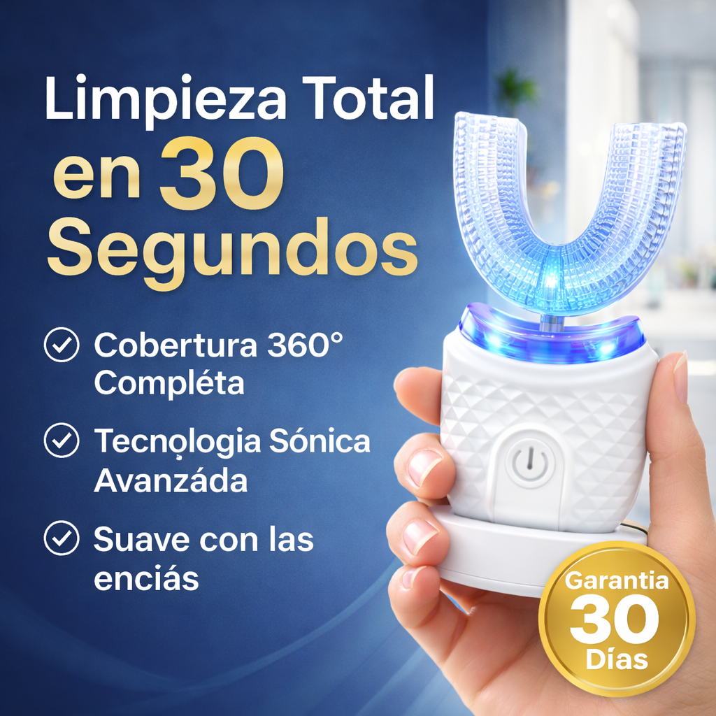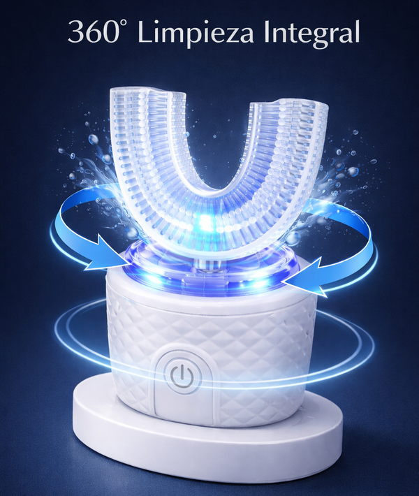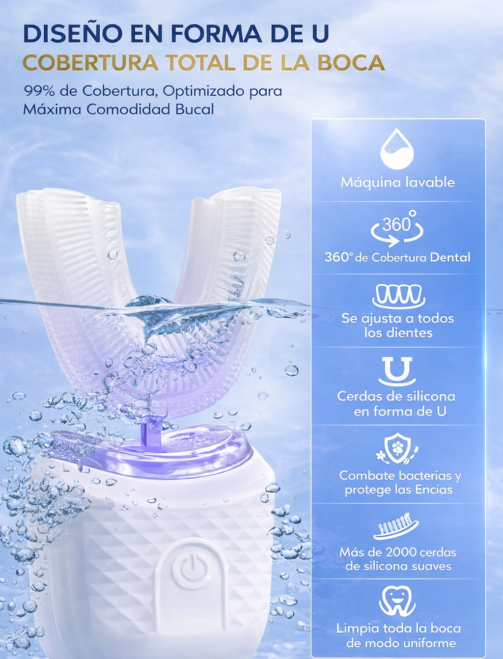 Su diseño en U de 360° y tecnología de pulso sónico limpian todos los dientes simultáneamente, reduciendo errores de cepillado y mejorando la consistencia.